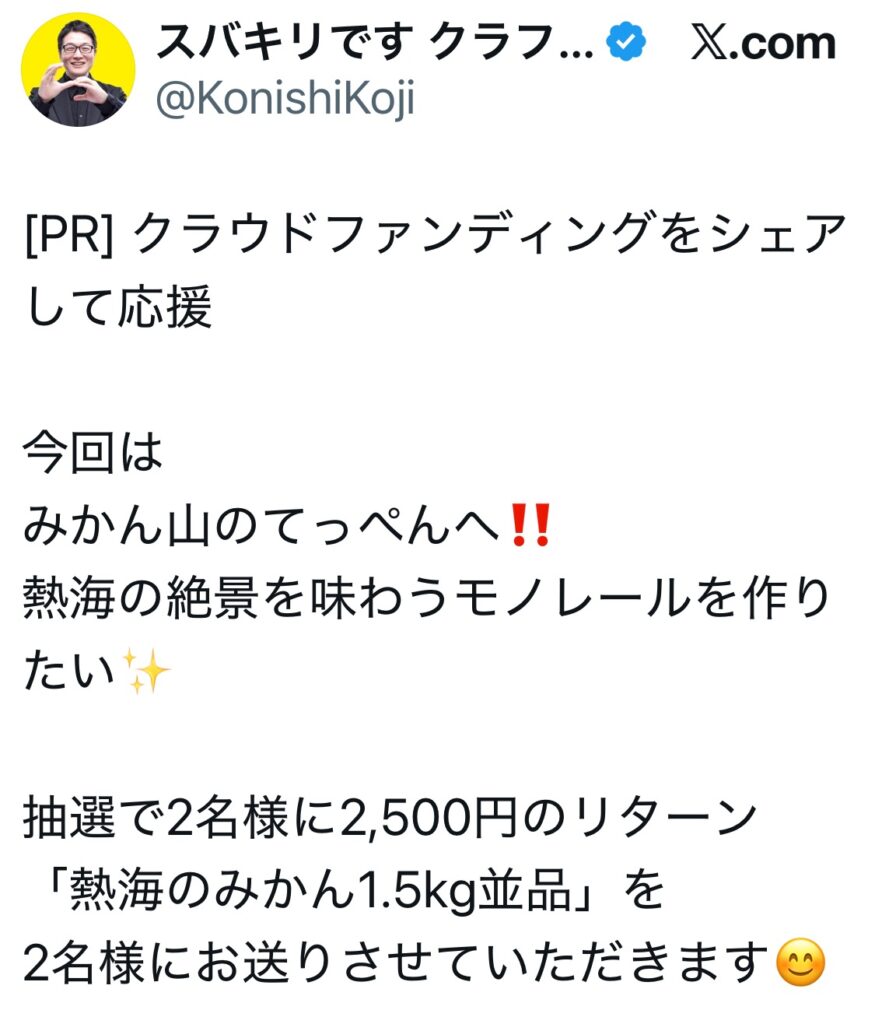 そうだな、、ゼロイチで興味を持ってもらうのは難しいから(プロジェクトに自信があればそれもアリ!)支援してくれた人に限定で案内を送って、プロジェクト拡散で支援リターンをさらにお得に抽選でバージョンアップします!みたいなのも面白いかも。